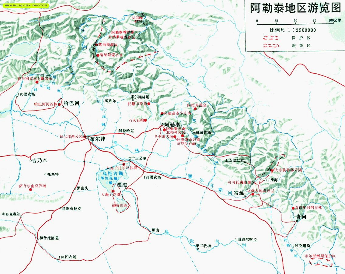 阿勒泰地區有高山森林、河谷風光、湖泊溫泉、巖畫石刻等旅游資源數量為185處。這里有美麗的喀納斯湖風景區、布爾根河河貍自然保護區、福海海濱風景區、蝴蝶溝、烏倫古湖海濱浴場、白沙湖、鳴沙山,以及高山風光、冰川雪嶺、湖泊溫泉、巖畫石刻,切木爾切克古墓群及草原石人阿勒泰市四面環山,地形奇異。