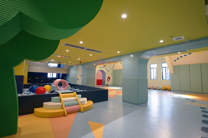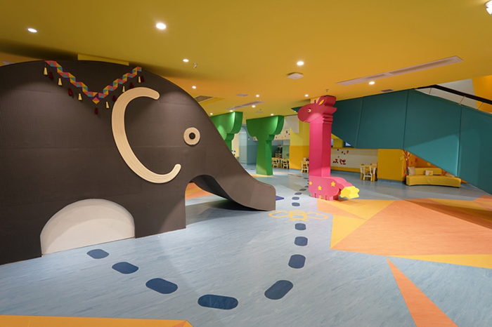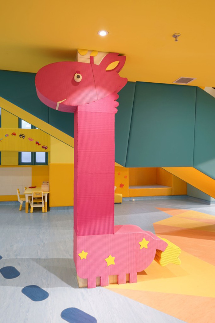 為學齡前兒童打造的“地球村”幼教娛樂空間結合動物、植物、地理和人文知識,寓教于樂,并設有安靜的樹屋寢室讓老師看護孩子們休憩。七巧板拼圖的地面抽象地展示了一幅世界地圖,大象、椰子樹、長頸鹿等卡通形象與滑梯、秋千、身高測量等功能結合于一體,空間環(huán)境為玩耍和教學提供了匹配的場景和無限的靈感。