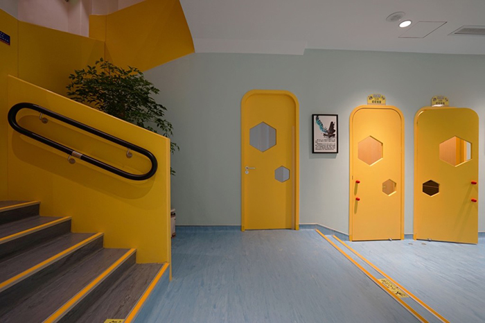 小蜜蜂“叮叮”是品牌的吉祥物,也是學府一系列專屬課程圍繞開展的核心卡通人物。室內設計以“叮叮”為主題,融入了蜂巢、翅羽、飛行等與蜜蜂相關的元素,以及品牌標志性的黃色,營造出清晰、富有個性的品牌空間。
