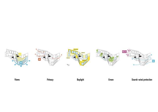 通過外牆的反射玻璃幕墻鏡像周圍的環境,由此強調了周邊的歷史價值,視覺上與鄰近社區相連接。不過,內部則是由一系列粗糙的,石制的露臺及大型花盆構成,整體建筑以綠植覆蓋,引入了人性化尺度。
