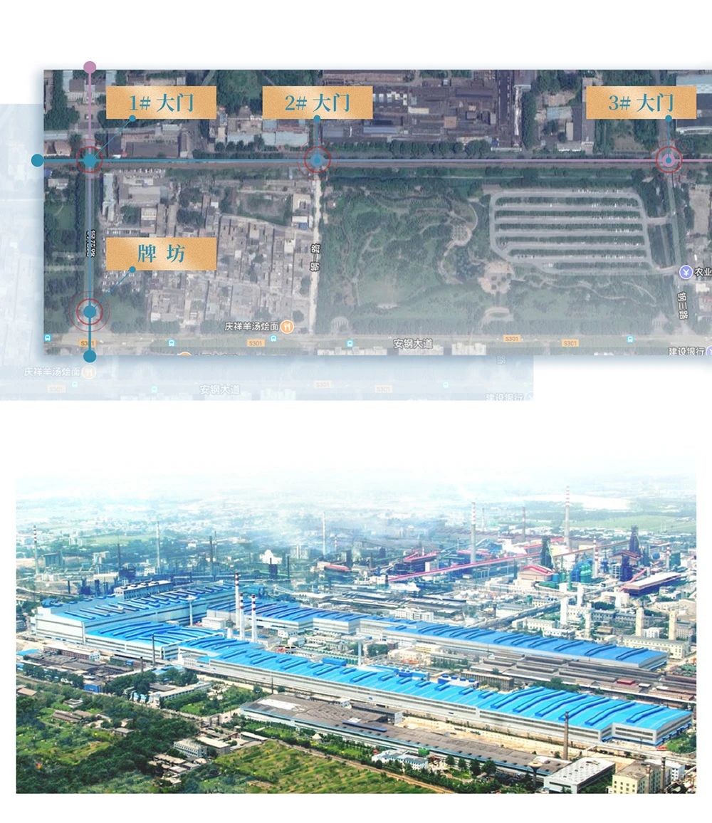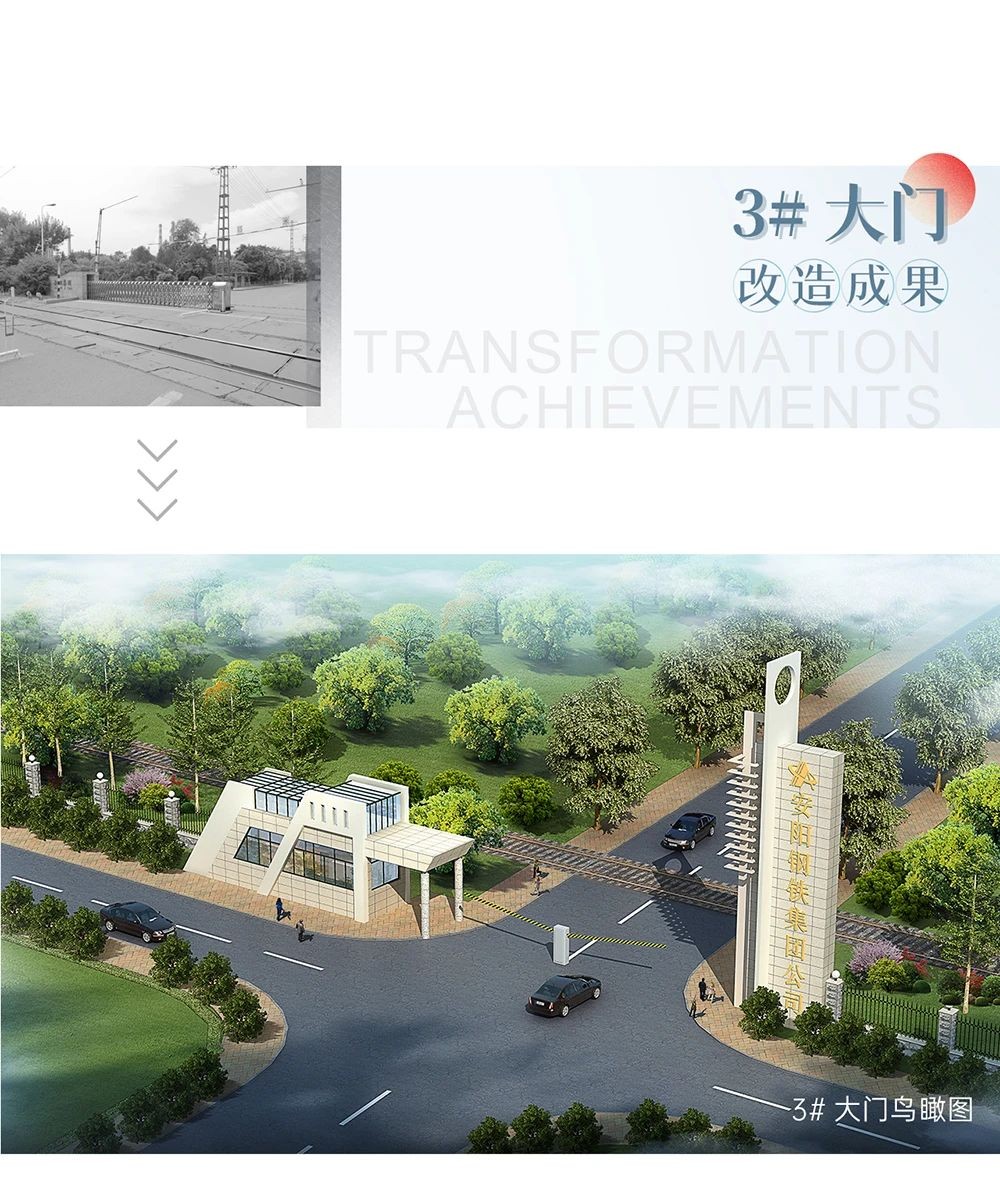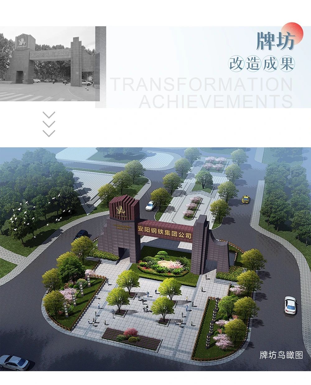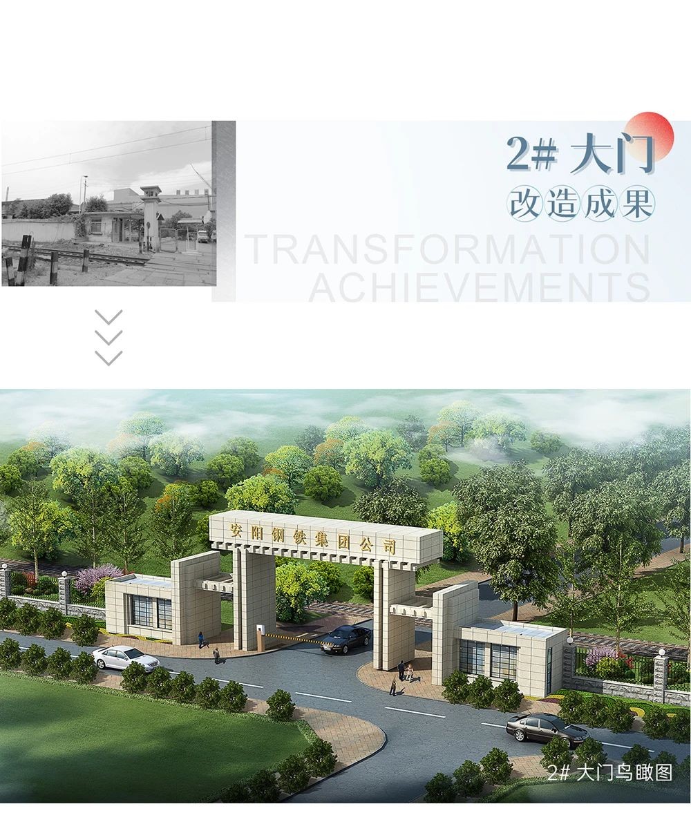 項目概況 :本項目參照標志文化和企業特色,大門造型應設計的穩重,敦厚。這樣才能更好的與周圍的環境協調融合。 提取鋼板為設計元素,意在突出行業屬性,整個造型,既表現鋼的質感,又傳達安鋼“鼎立中原”的內涵。標志簡潔、現代感強、外柔內剛。 立面設計更多提取安鋼廠區工作中常見元素,如鋼鐵、機械元素。使大門更貼近工作環境并具有企業特色。給人一種親切感。